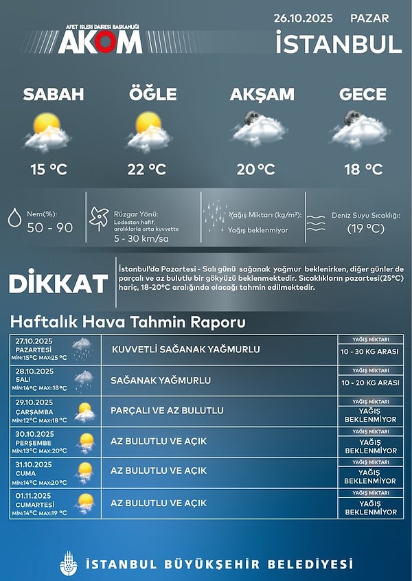 AKOM’un paylaştığı diğer tahminlere göre haftanın geri kalanında hava sıcaklıkları mevsim normalleri civarında seyredecek. 28 Ekim Salı da sağanak yağış beklenirken çarşambadan itibaren havanın parçalı ve az bulutlu olması öngörülüyor.