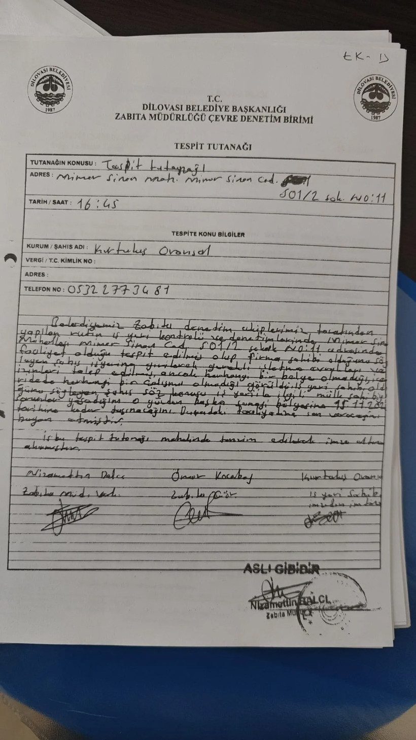 “Belediyemiz zabıta ekipleri tarafından yapılan rutin denetimlerde… iş yerine girilerek işletme evrakları ve izinleri talep edilmiş, ancak herhangi bir belge olmadığı, içeride herhangi bir çalışma olmadığı görüldü. İş yeri sahibi olduğunu söyleyen şahıs mülk sahibiyle sorunlar yaşadığını, o yüzden başka sanayi bölgesine 15.11.2025 tarihine kadar taşınacağını, buradaki faaliyetine son vereceğini beyan etmiştir”